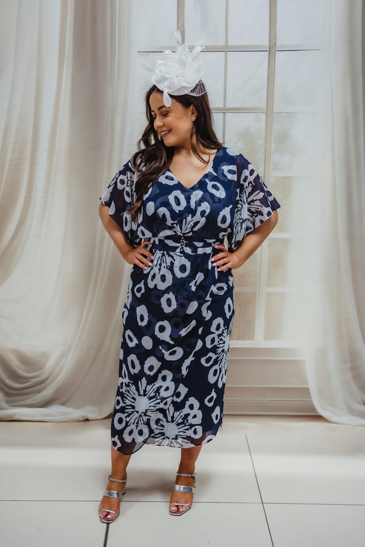 Lizabella Navy And White Chiffon Dress With Flutter Sleeves