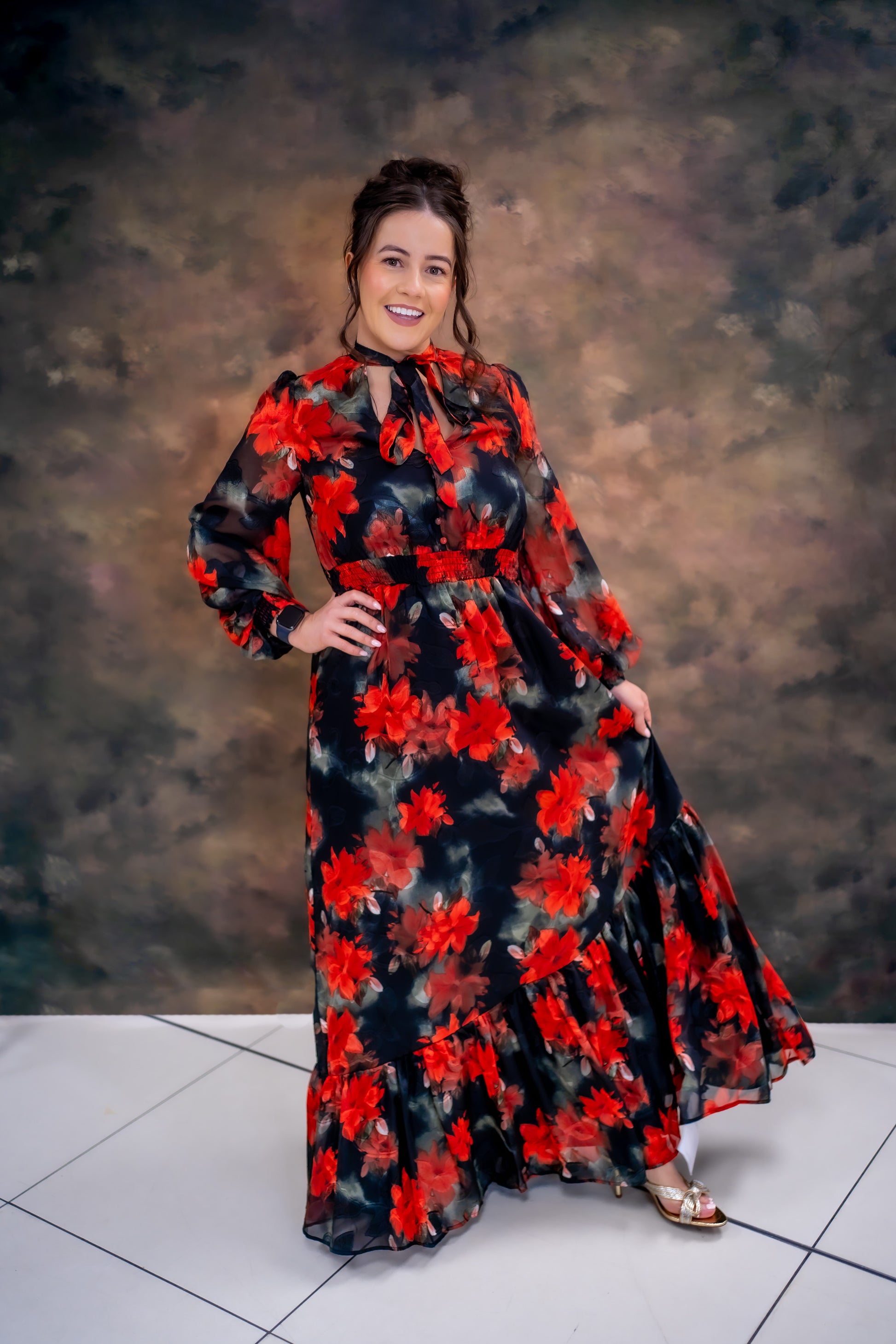Lovedrobe Floral Tie Neck Long Sleeve Maxi Dress